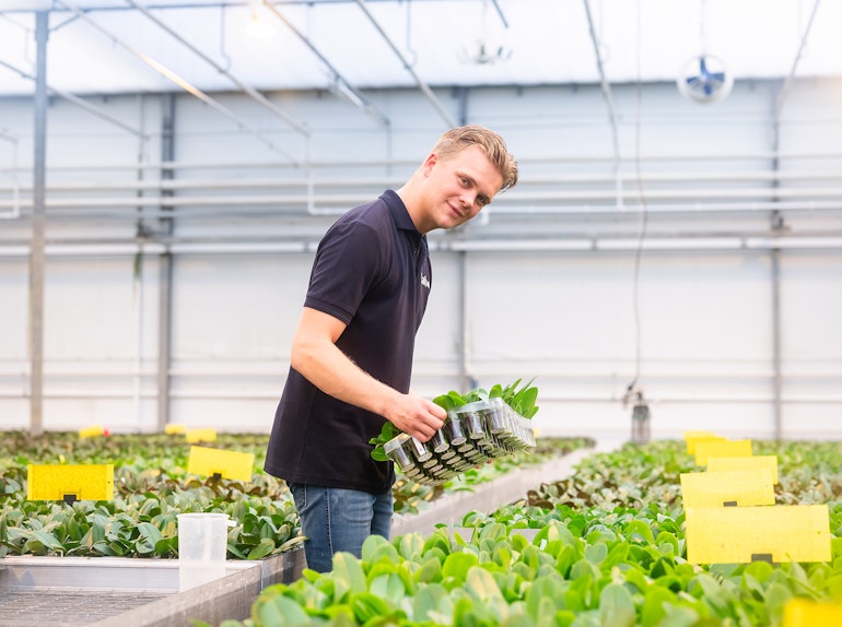 In onze kassen in De Lier en Lochristi kweken we de kleine plantjes uit het labo op tot jongplanten. In deze kassen groeien planten in sterk gecontroleerde omstandigheden (licht, voeding enzovoort) tot wanneer ze klaar zijn om naar onze klanten – de telers die de planten tot bloei brengen – te vertrekken.